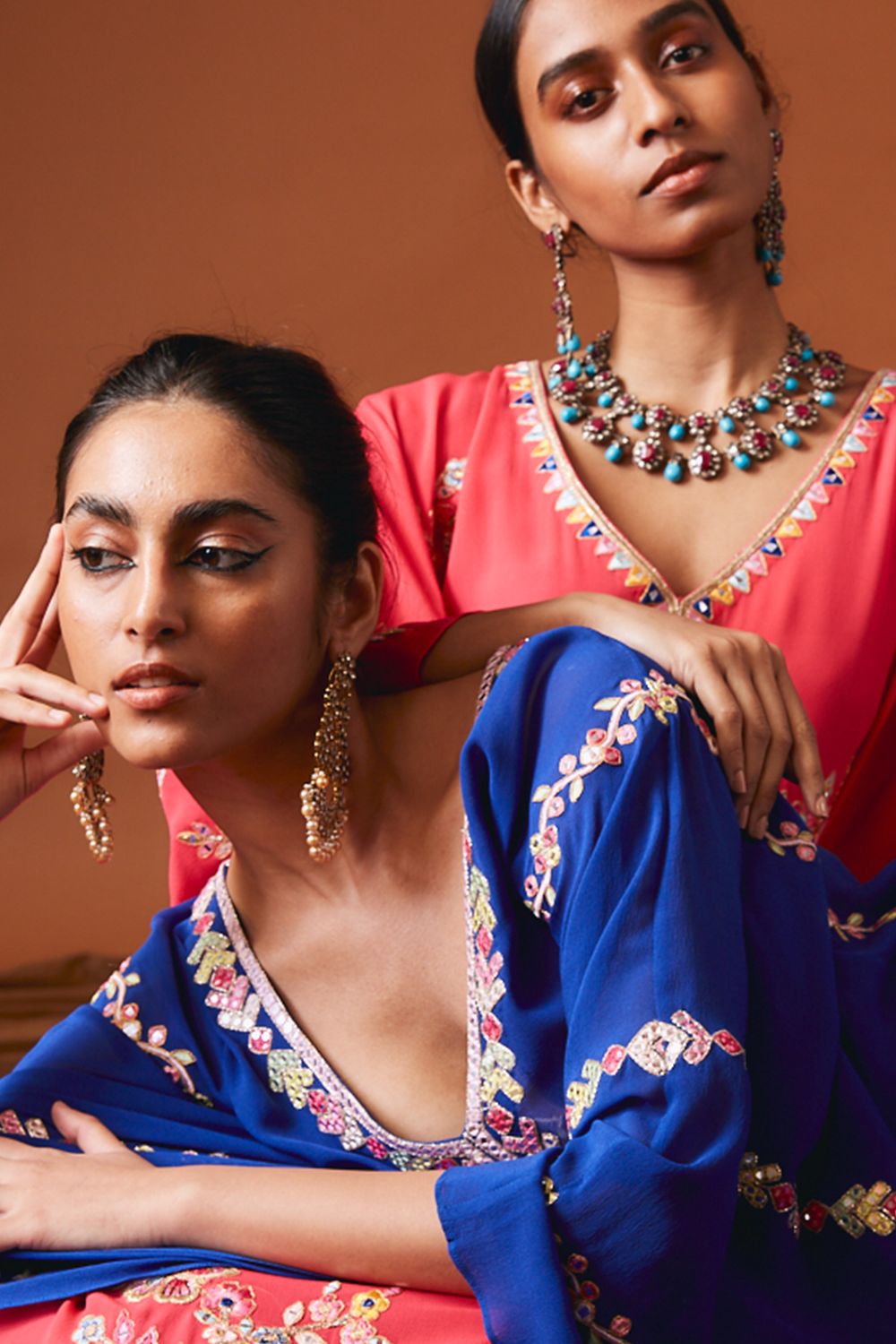 Royal Blue Georgette Kaftan With Resham,Foil,Mirror And Gota Embroidery.This Is Paired With An Embroidered Belt