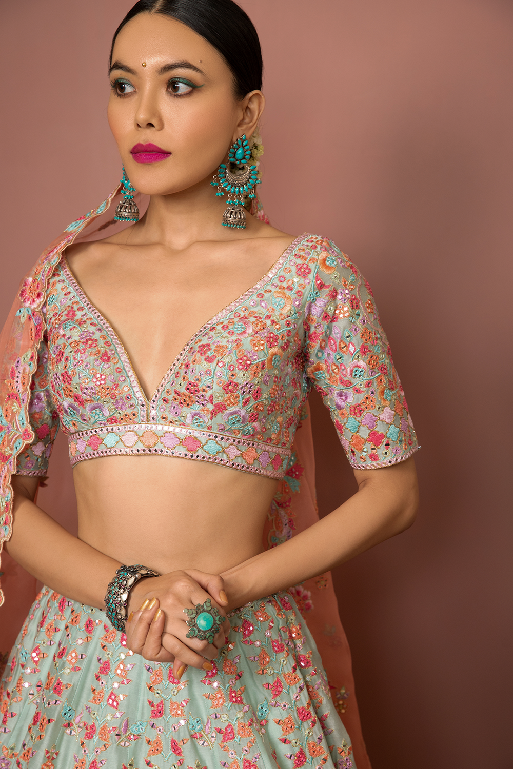 Blue Heavily Embroidered Lehenga Set Paired With A Blush Peach Organza Dupatta With Resham,Mirror,Dori Embroidery