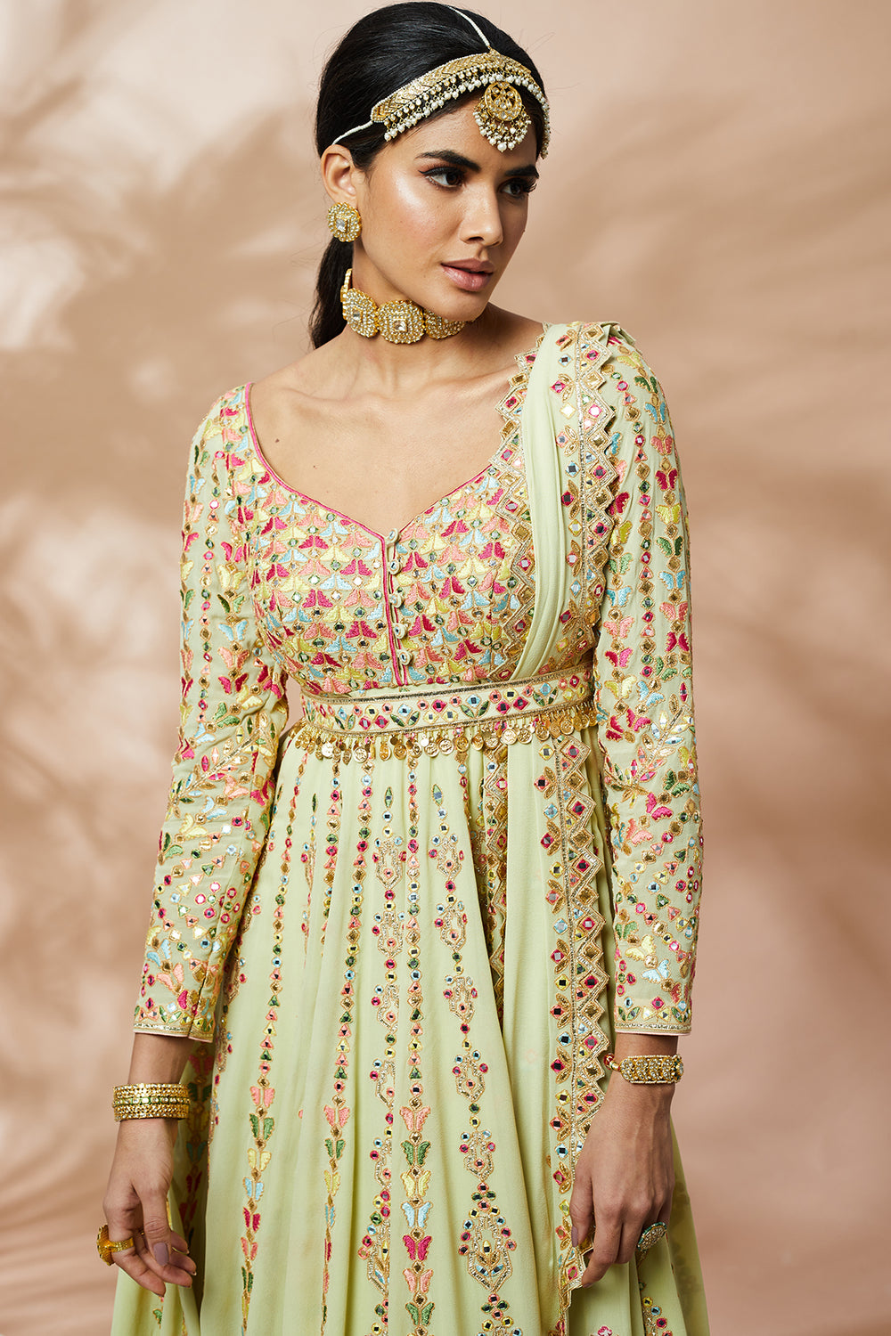 Green Georgette Floor Length Anarkali With Gota, Resham And Foil Embroidery With An Embellished Belt