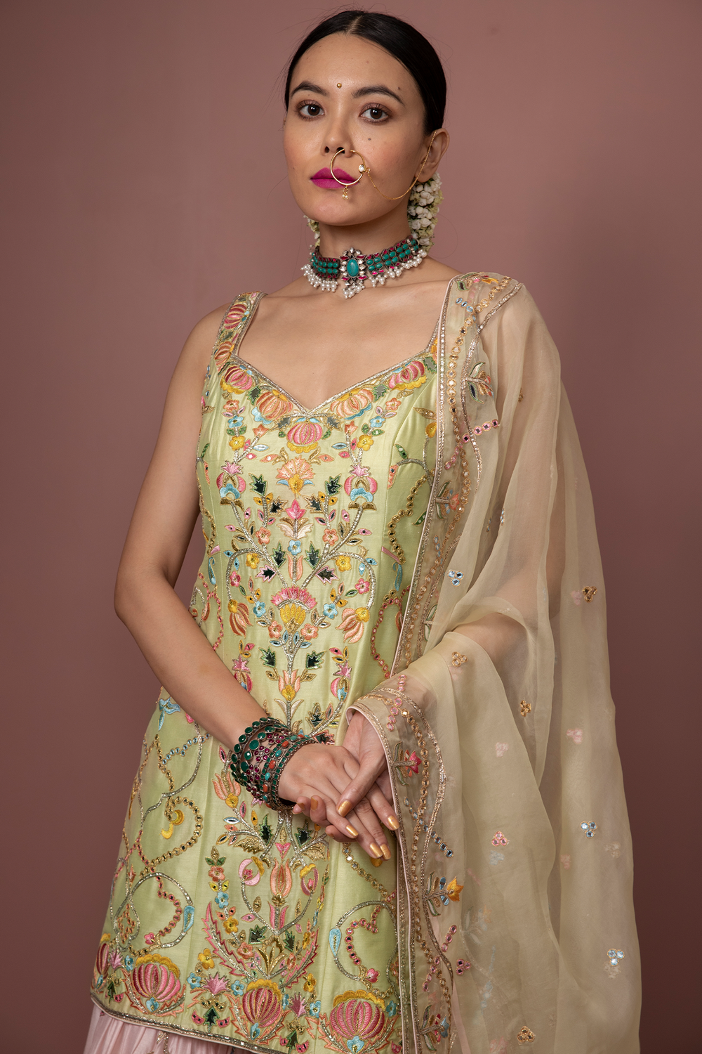 Green Kurta With Blush Peach Frill Gharara With Resham ,Foil,Mirror,Gota And Dori Embroidery..The Dupatta Had Pretty Tassels On One Side To Add A Pop Of Colour