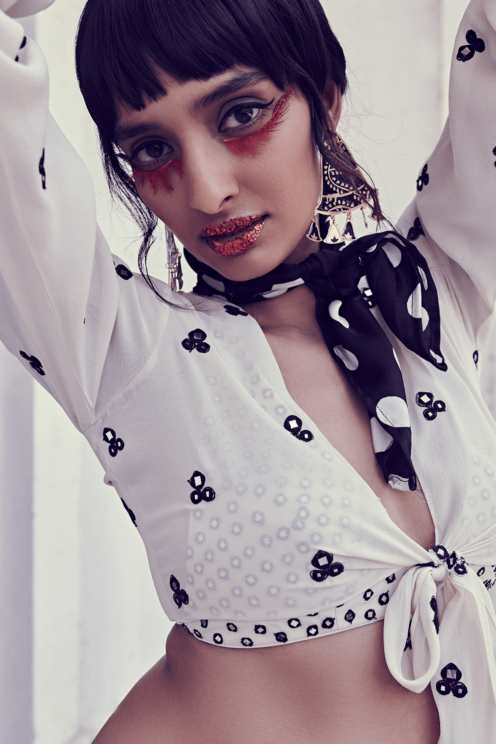 The Black And White High Waist Pants With A Tie-Up Top And A Bikini, This Set Is Embroidered With Resham And Mirror