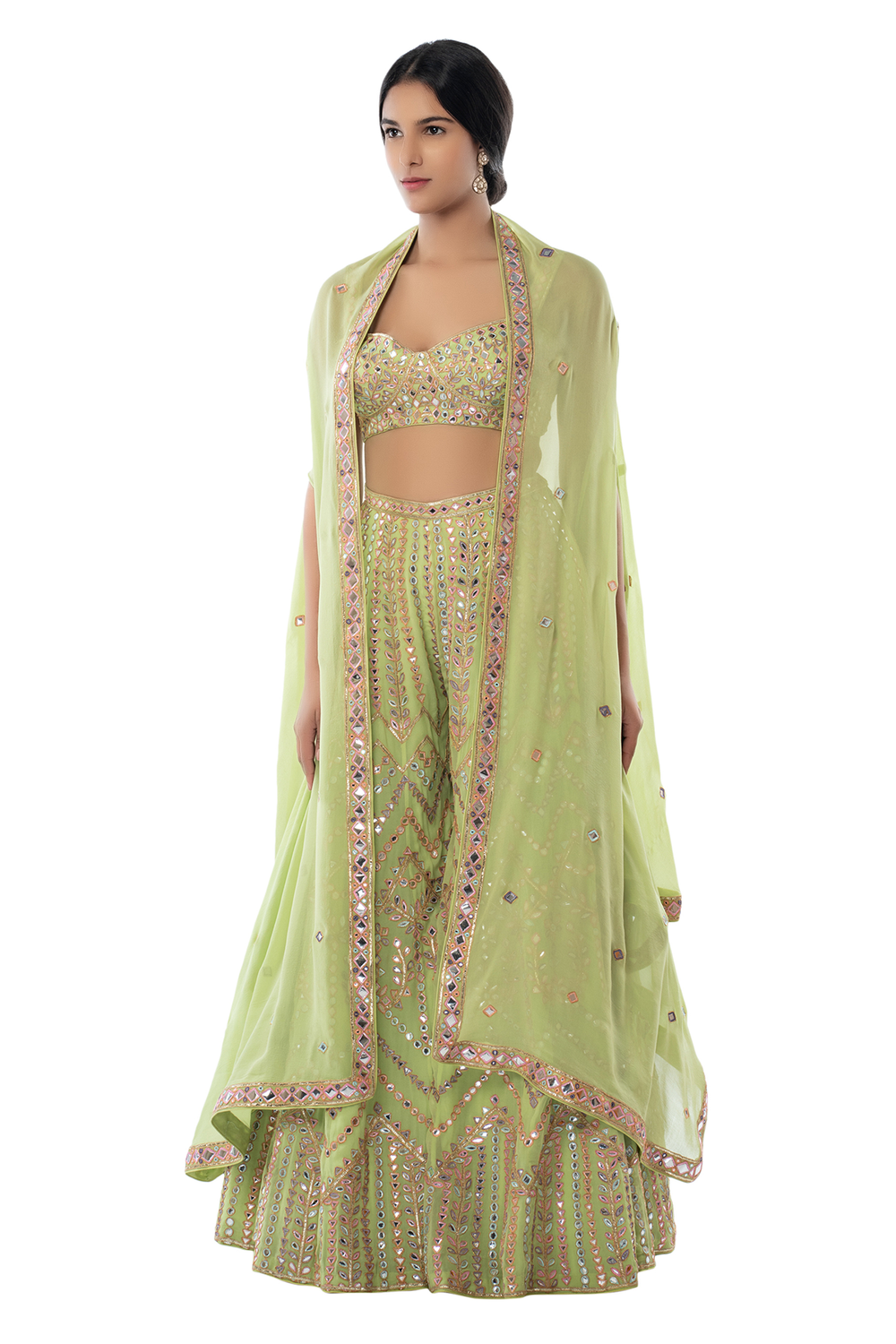 Pista Green High Waist Sharara With Blouse And Cape Emroidered With Foil, Resham