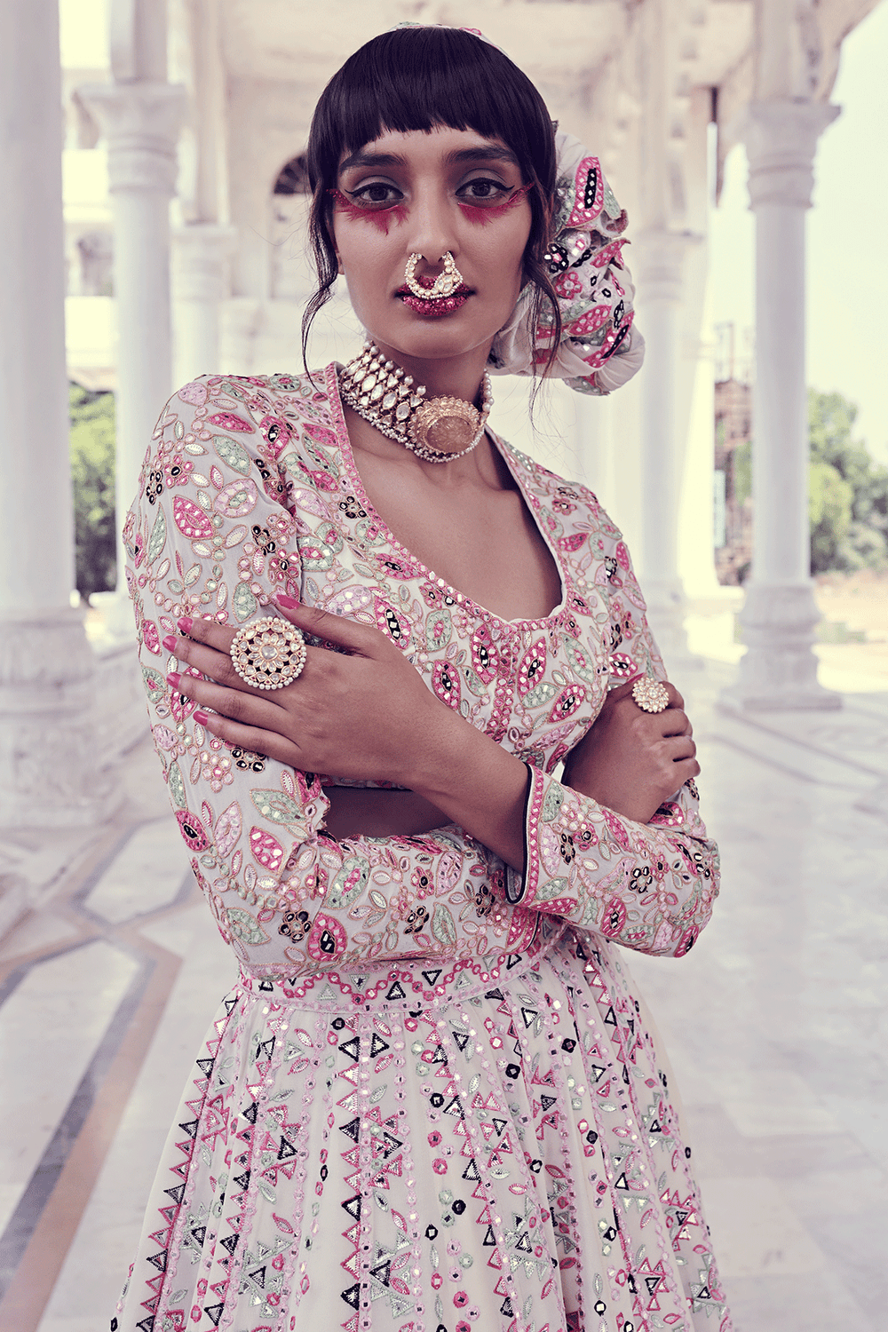 The Ivory Lehenga Set With Aztek Inspired Embroidery In Multi-Color Resham , Mirror, And Foil