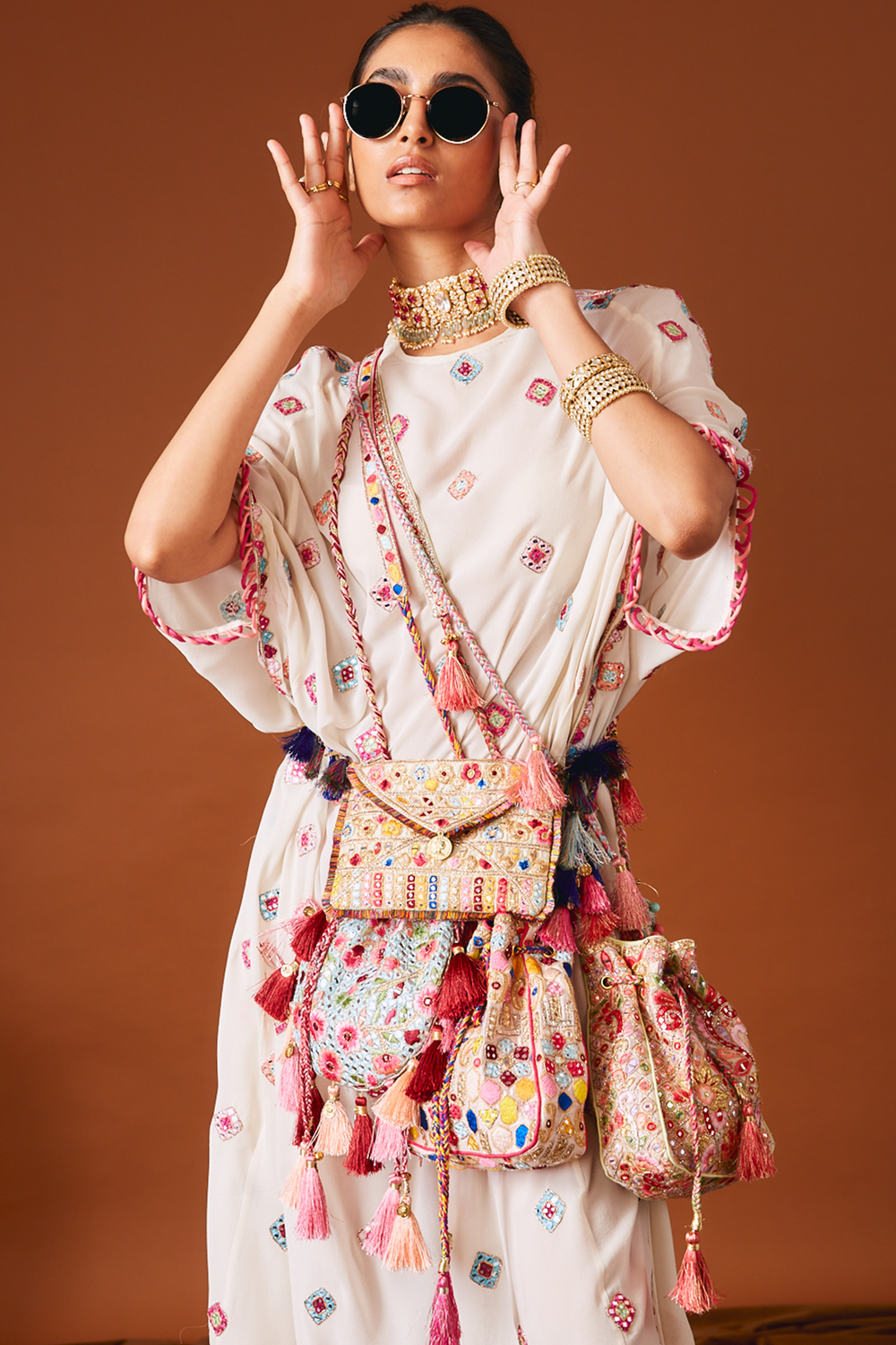 Ivory Georgette Kaftan With Multi coloured Motifs In Resham, Mirror And Dori