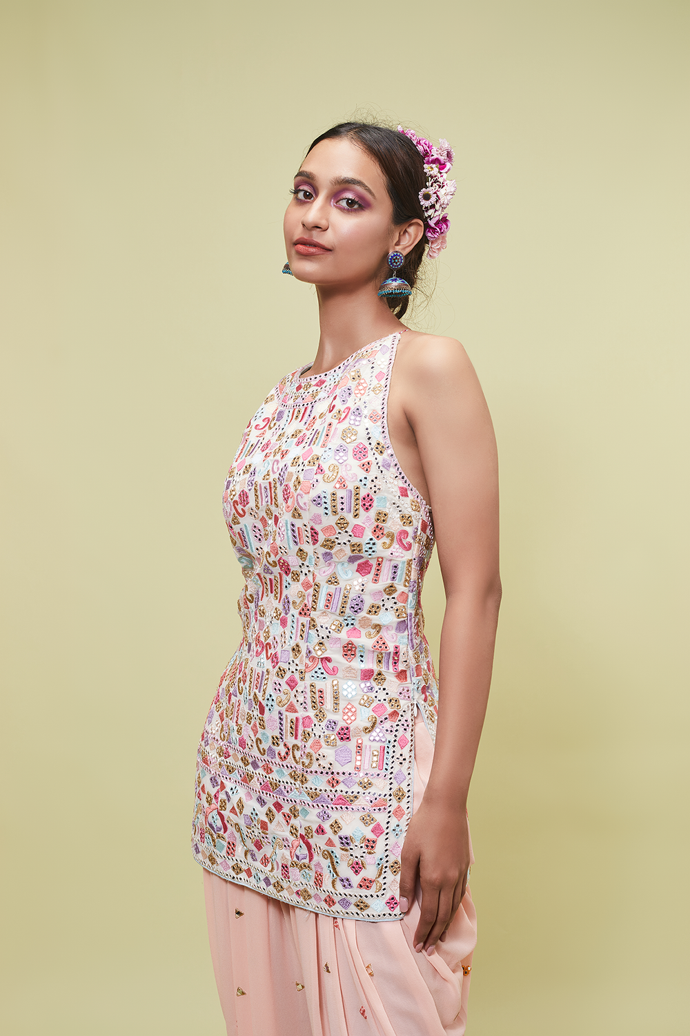 Ivory Georgette High Neck Kurta With A Sexy Tie Up Back Paired With Cowl Pants, This Set Is Embroidered With Resham And Mirror