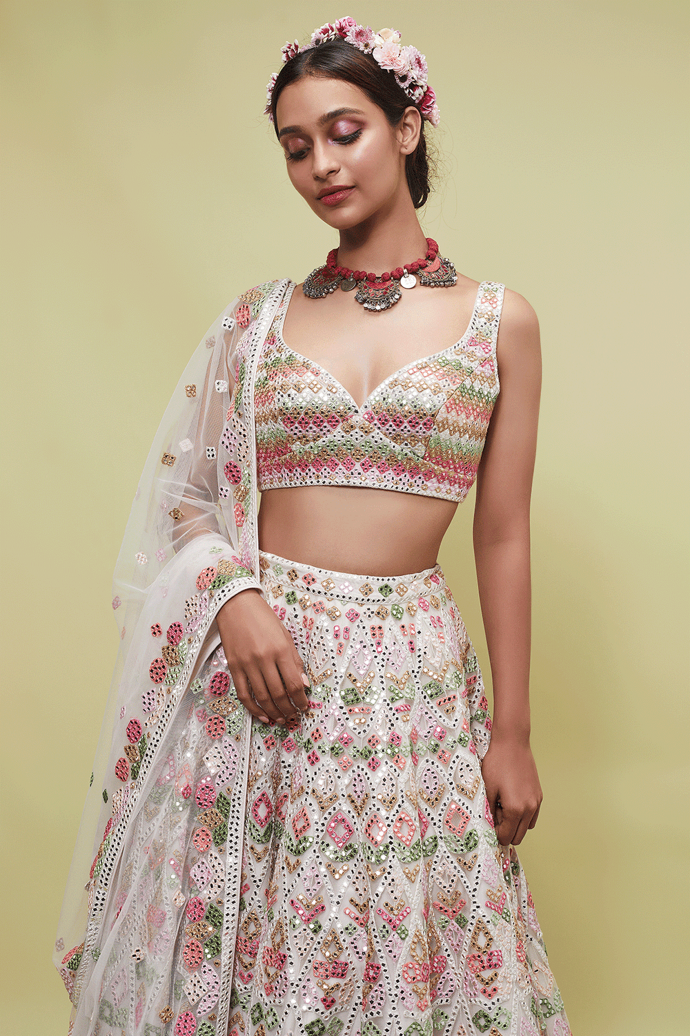The Ivory Net Lehenga Set With Multicolored Resham And Mirror Embroidery