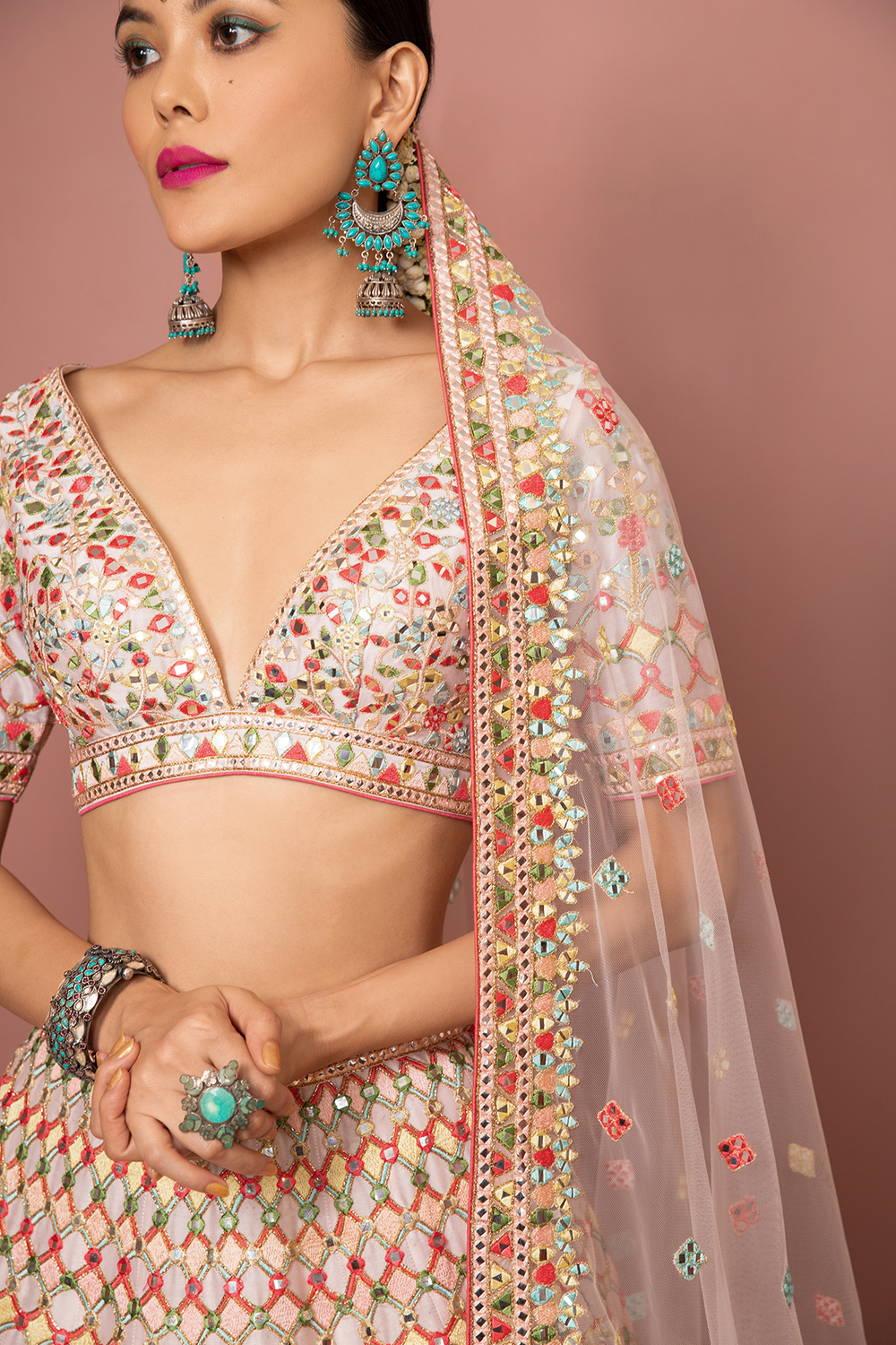 Light Blush Pink Mirror, Resham Detailed Lehenga Set