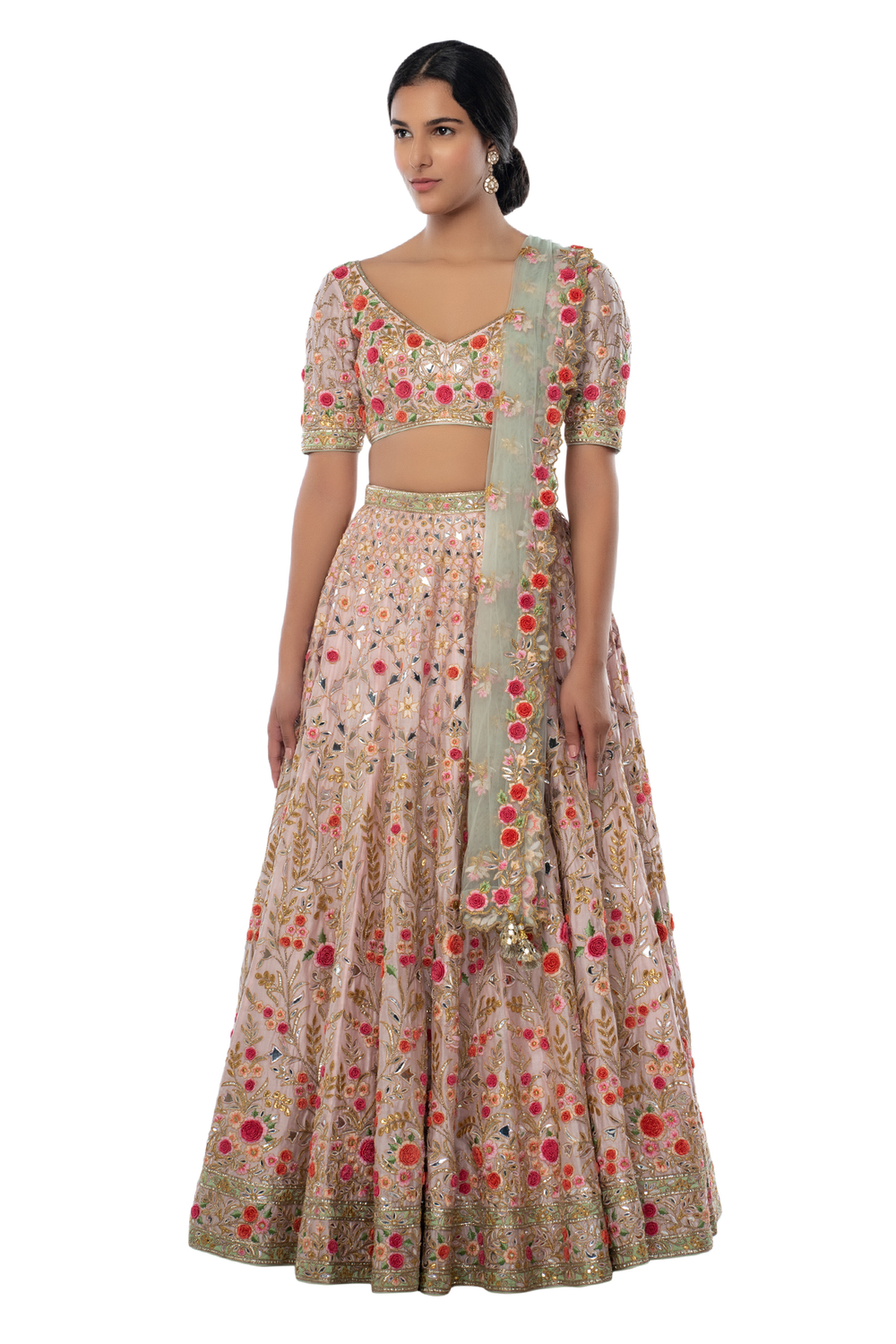 Light Pink Chanderi Lehenga Set With Mint Green Blouse And Dupatta. Lehenga Has Gota, Resham, Dori, Foil And Mirror Embroidery, Light Green Net Dupatta.