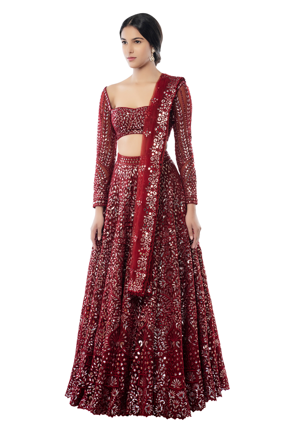 Maroon Net Heavy Lehenga With Foil, Resham, Mirror Embroidery