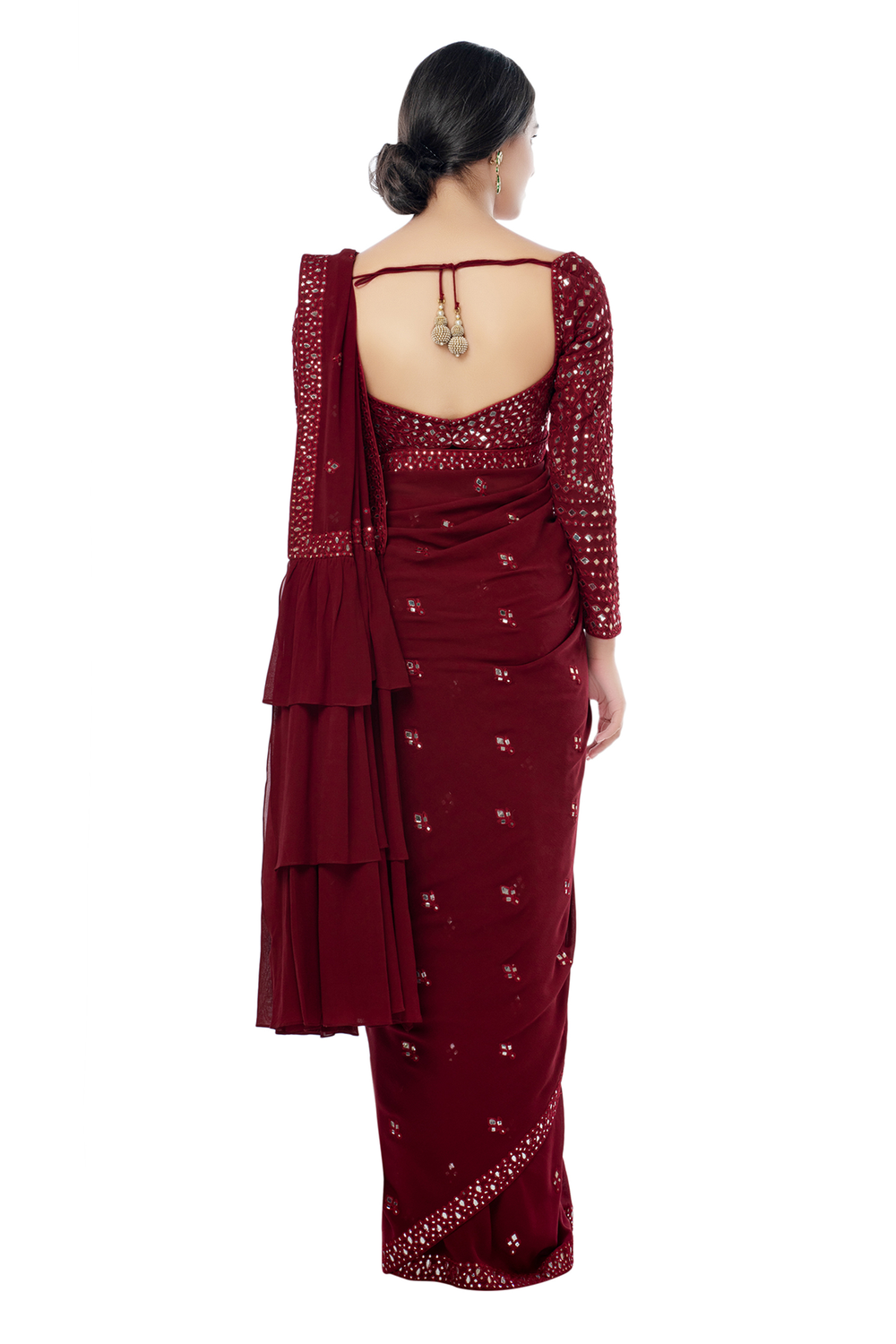 Maroon Georgette Saree Set With Foil Resham Embroidery With Frill Detailing On The Palla
