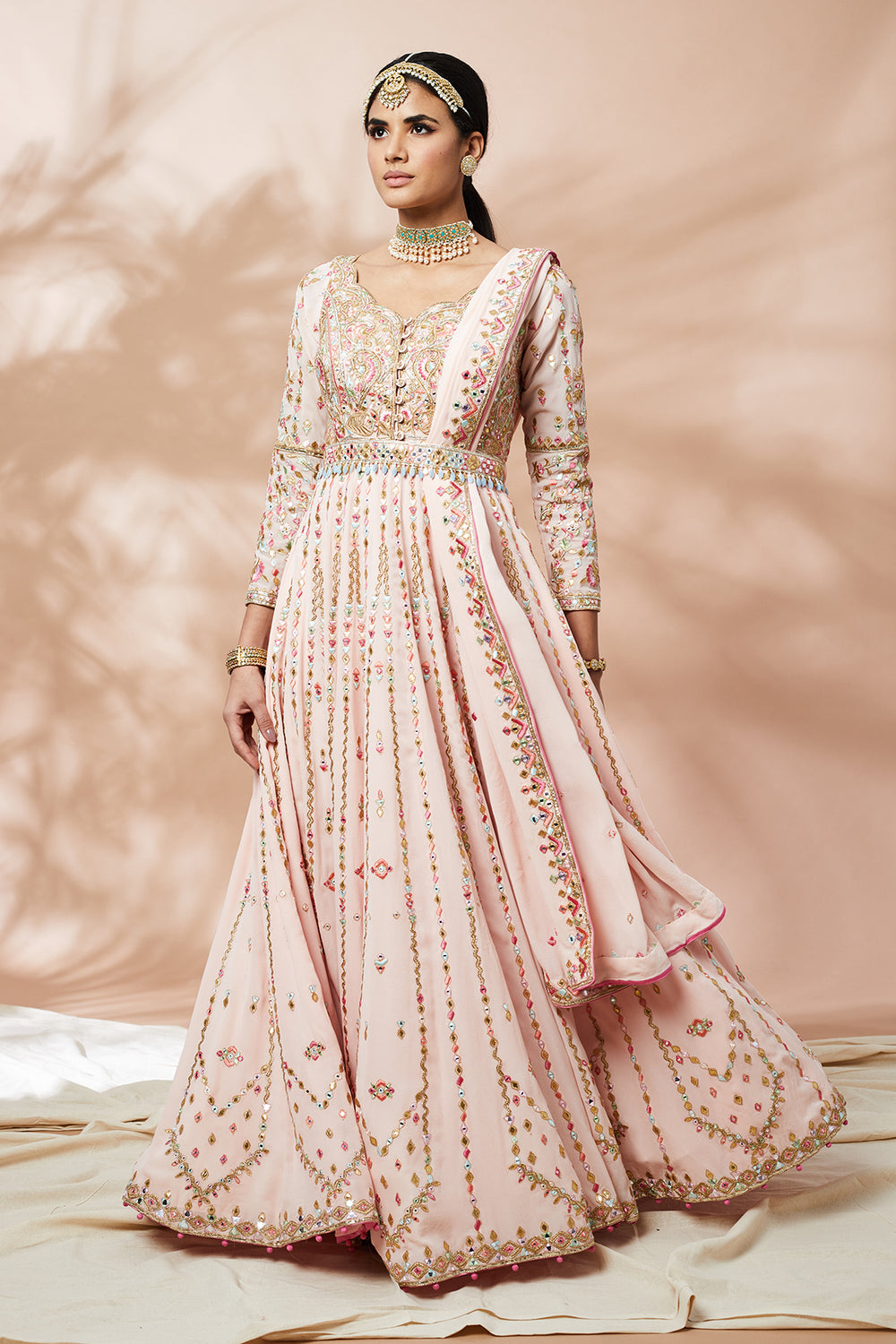 Peachy Pink Georgette Floor Length Anarkali With Gota,Resham,Mirror Embroidery Paired With An Embellished Belt