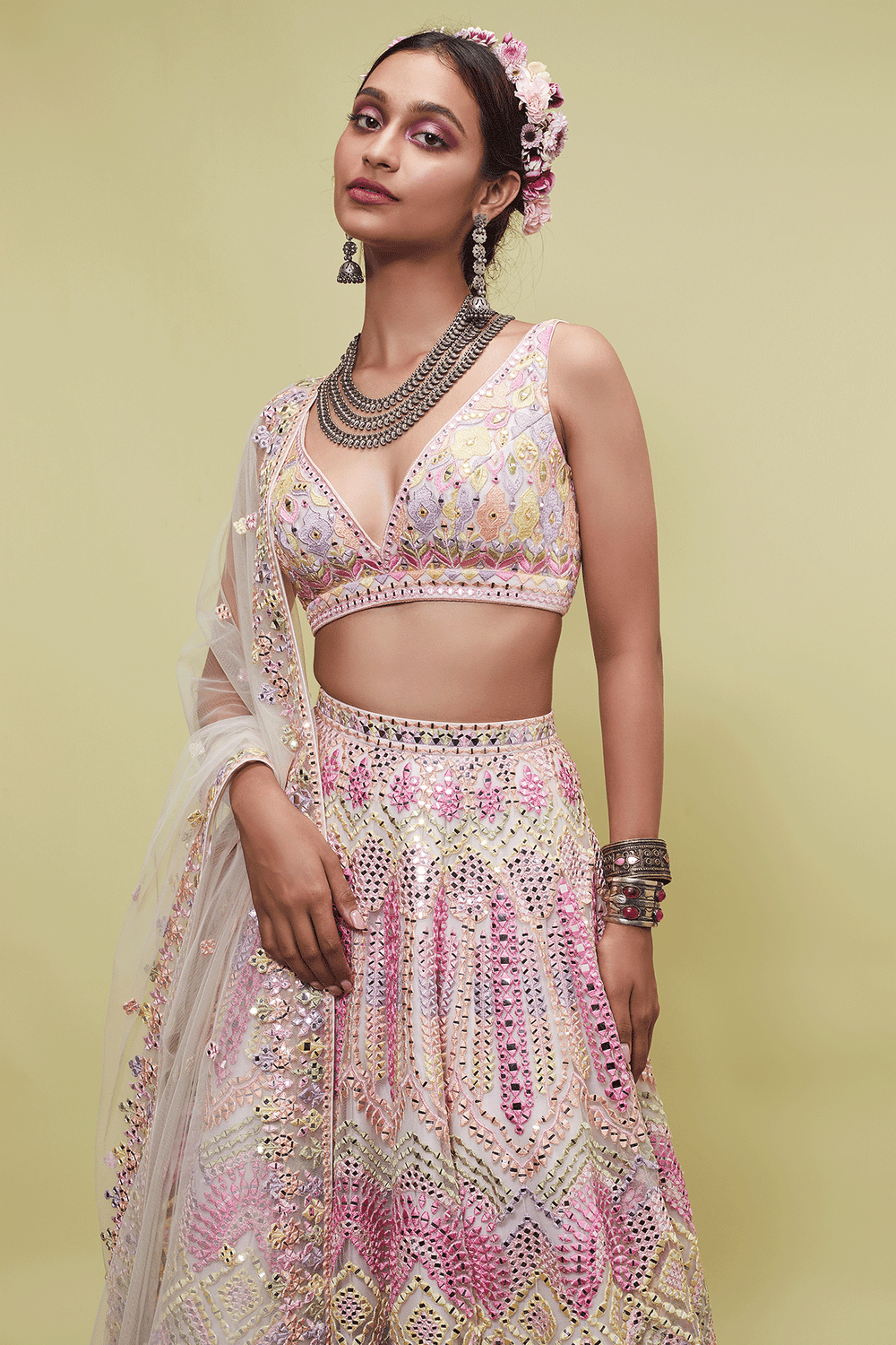 The Light Peach Net Lehenga Set With Heavy Resham And Mirror Work Embroidery