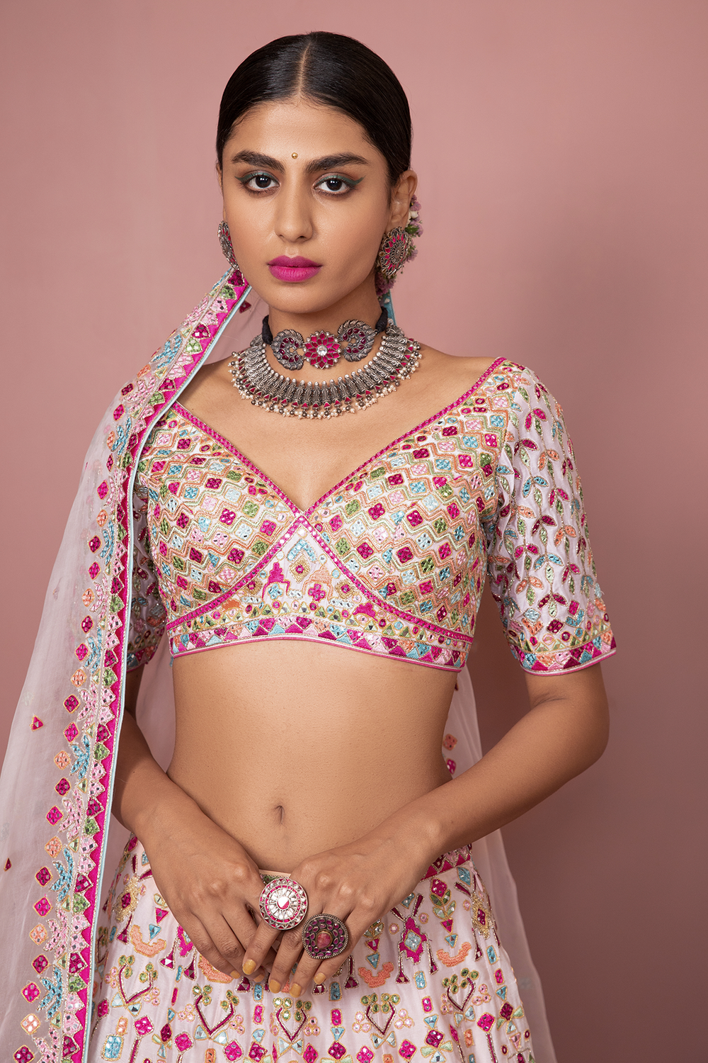 Pink Chnaderi Lehenga Set With Pop Resham Colours