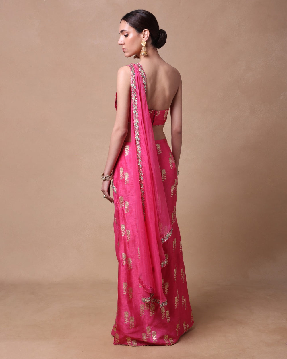 Pink Drape Skirt With A Saree Drape And Tube Blouse.