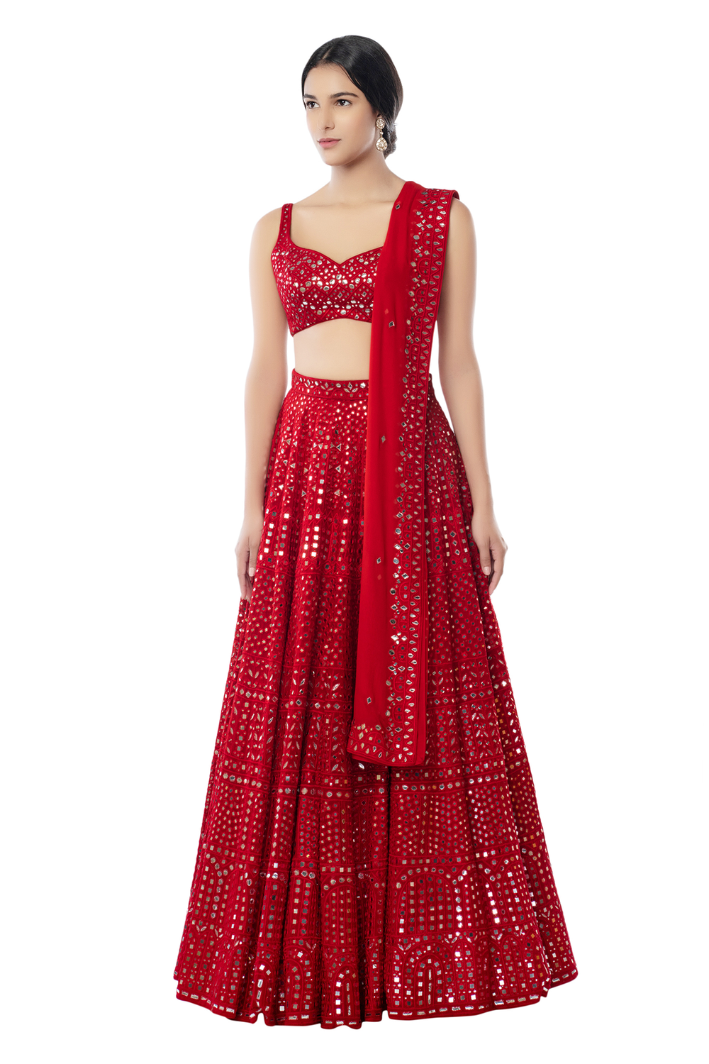 Red Georgette Heavy Geometry Lehenga With Foil Resham Embroidery