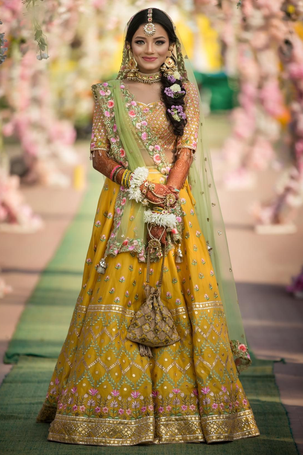 Mustard Chanderi Lehenga Set With Resham, Gota Embroidery Set With Pink Blouse And Sage Green Dupatta
