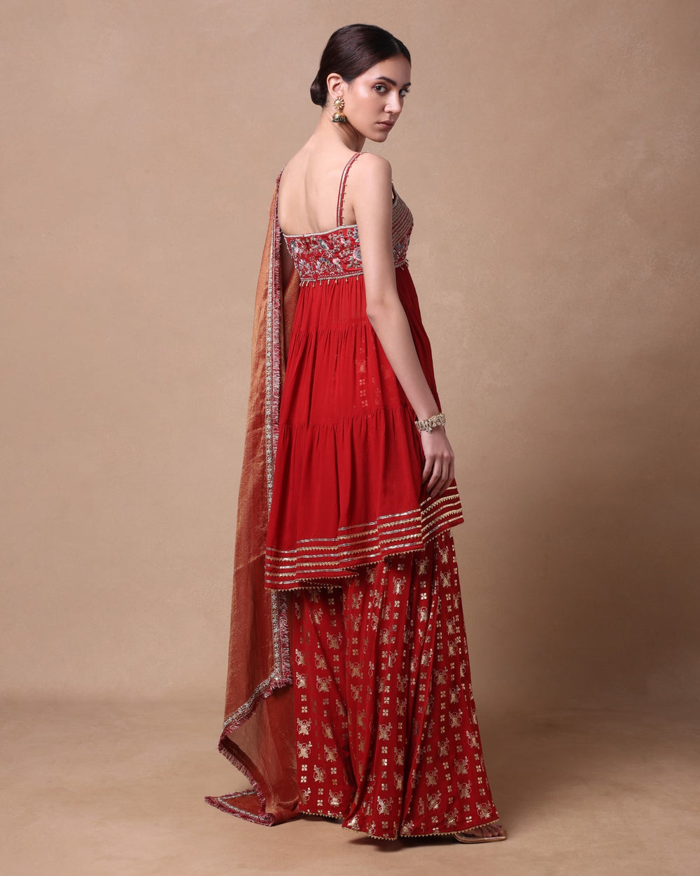 Rust Georgette Embroidered Bodice Strappy Kurta With A Foil Printed Sharara And A Georgette Tissue Dupatta.