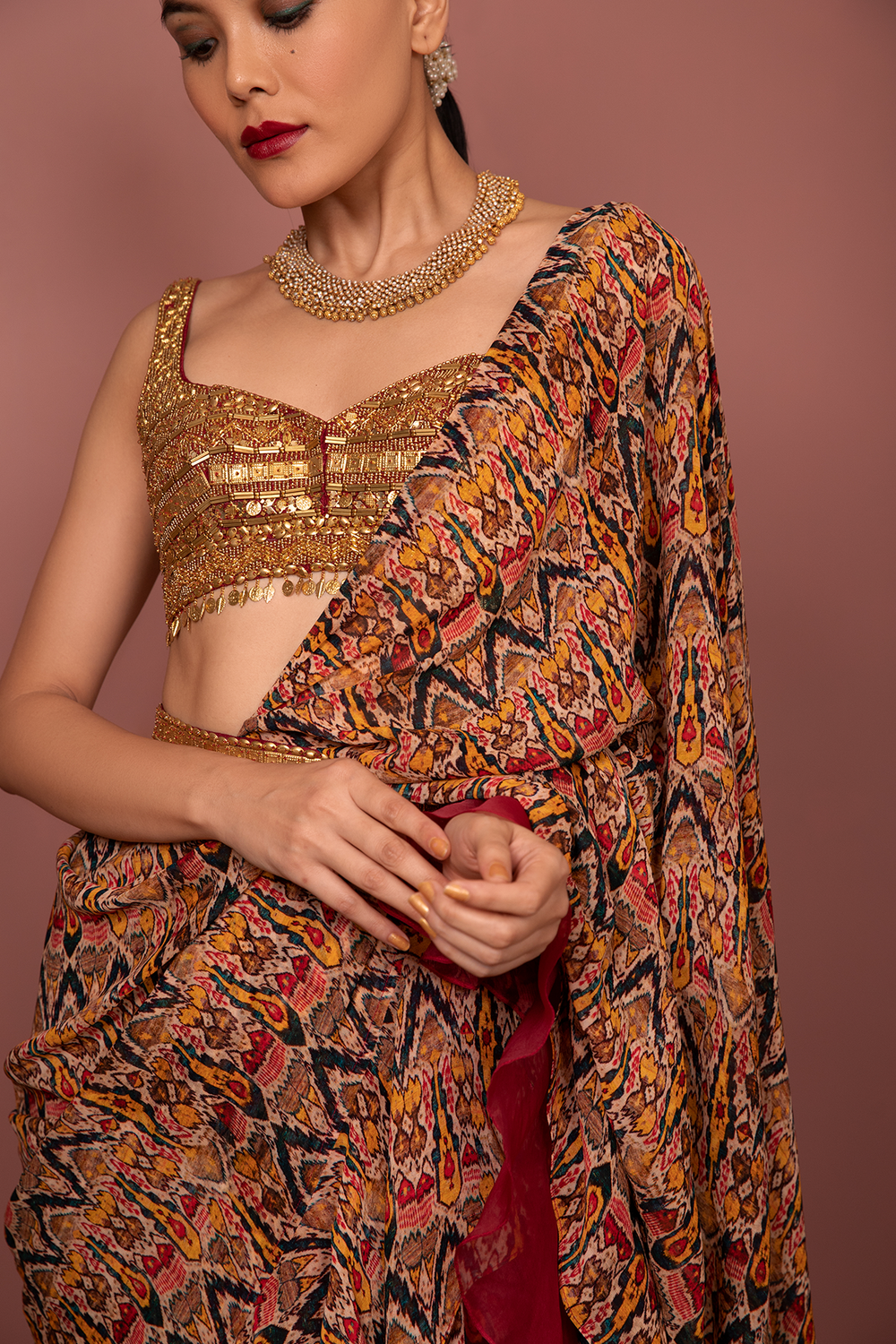Tribal Printed Saree With Maroon Organza Ruffles Paired With Gold Beaded And Metallic Blouse And Belt