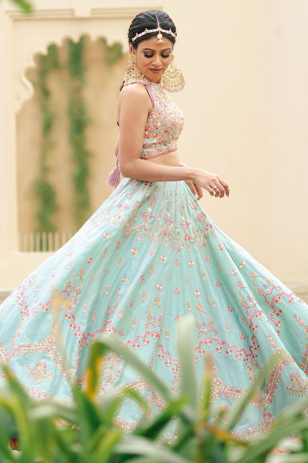 Blue Chanderi Lehenga Set With A Halter Tie Up Low Back Blouse And Peach Organza Dupatta.The Embrodiery Elements Are In Resham,Mirror,Foil Dori And Fabric Scallop Detailing On The Lehenga Bottom And Dupatta