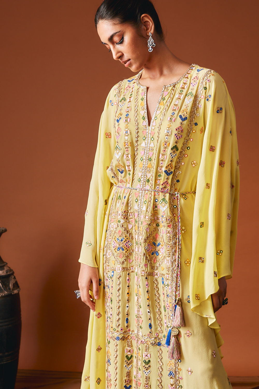 Yellow Aztek Embroidered Kaftan With Multicolour Resham ,Mirror And Gota .Paired With A Belt