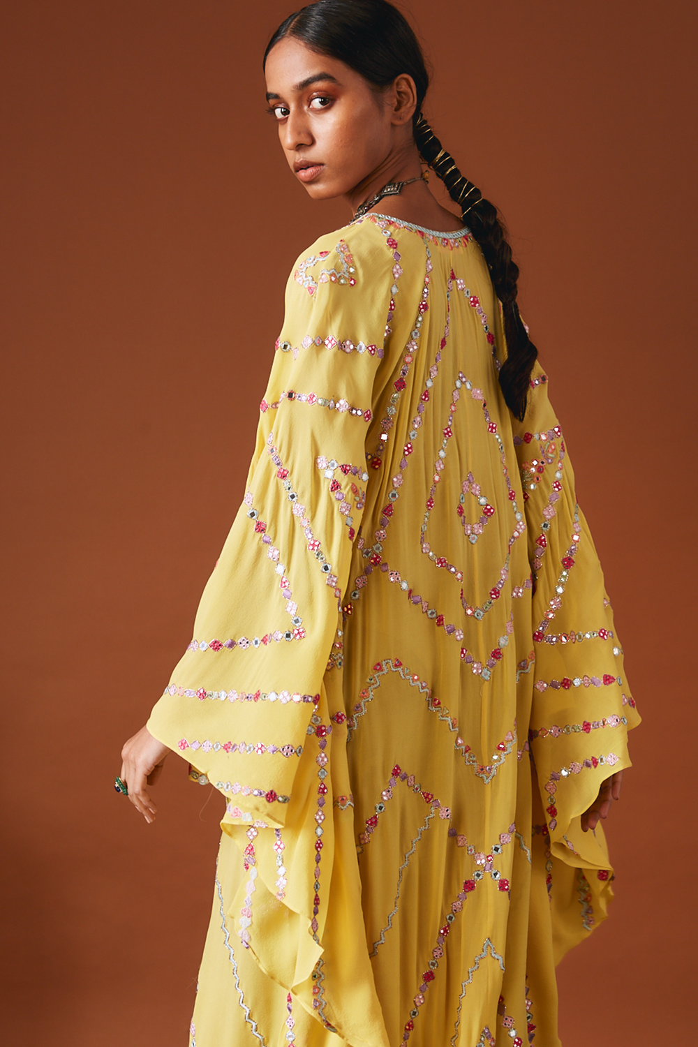 Yellow Georgette Kaftan With Multi Colour Resham, Mirror And Dori Embroidery