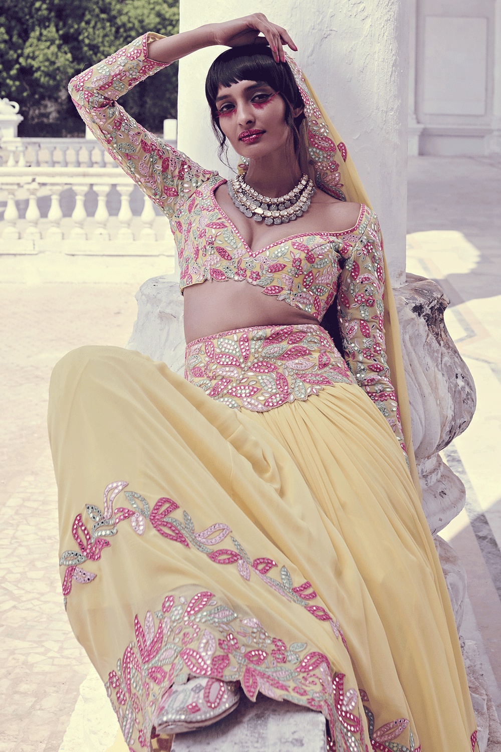 The Yellow Georgette Lehenga With Cutwork Embroidery In Resham And Mirror