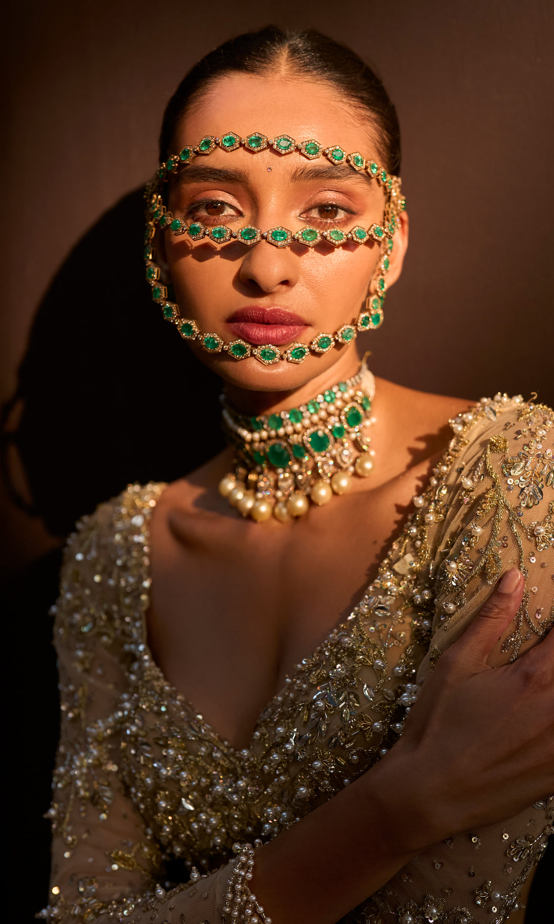 This Champagne Gold Brocade Lehenga Set is crafted in rich brocade silk and finished in an elegant beige-gold hue, offering a timeless yet modern bridal statement. The voluminous skirt features intricate pearls, sequins, cutdana, salli, badla, sadi, and dense gold sequin–zari work along the hem, creating a luxurious, shimmering finish. It is paired with a richly embellished high-neck choli and sheer hand-worked sleeves, bringing together traditional craftsmanship and contemporary glamour. A refined choice for weddings, sangeets, and reception celebrations.