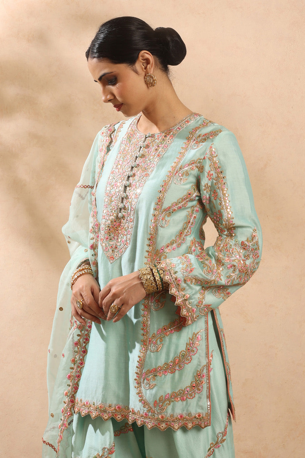 ● Store your kurta set in a cool, dry place, preferably in a garment bag, to preserve fabric quality.
