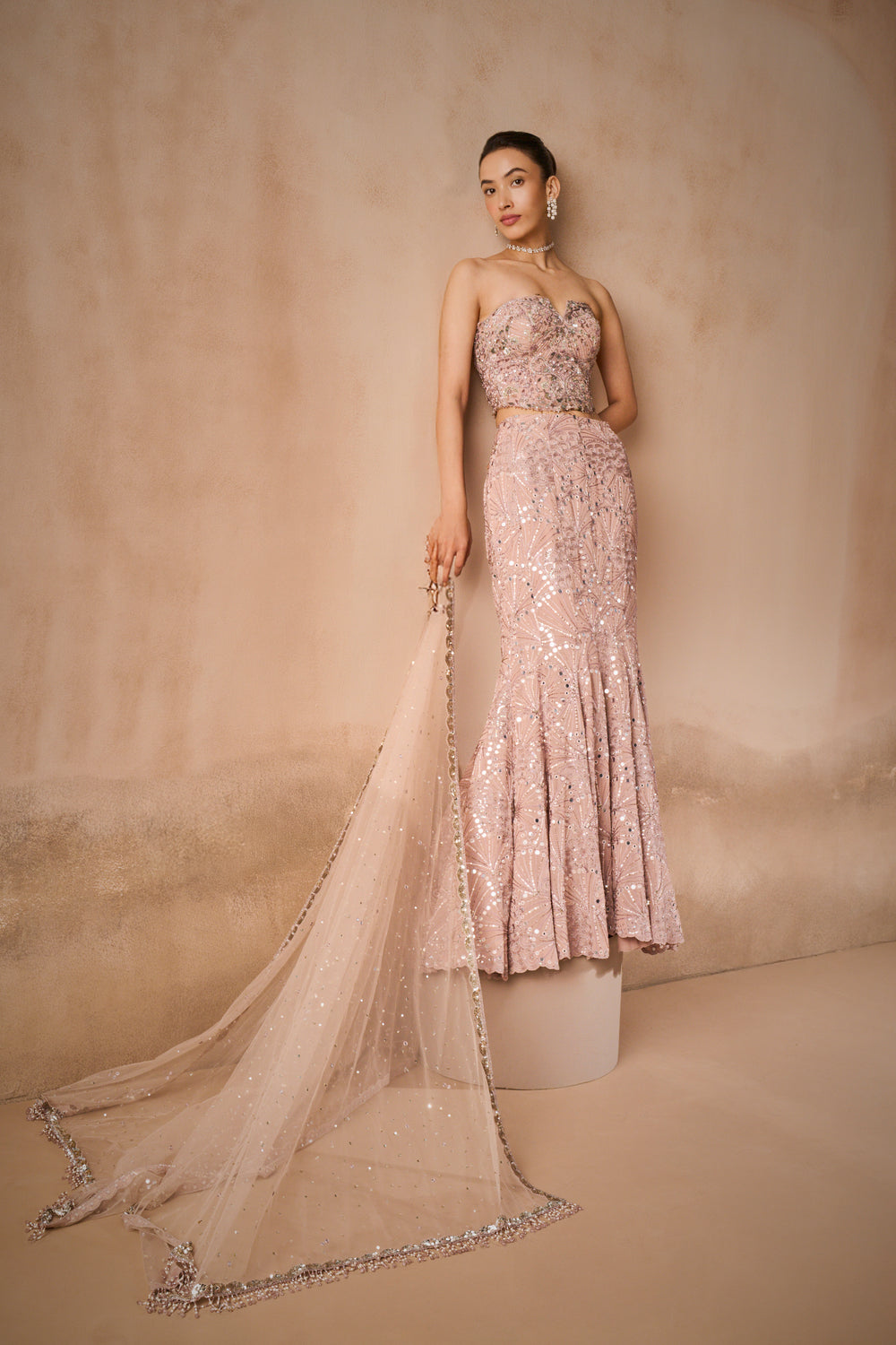 Draped in mauve moonlight, this fit-and-flared georgette lehenga from Tamanna Punjabi Kapoor’s Noctelle collection channels ethereal elegance with a modern edge. Paired with a sculpted corset blouse and a dreamy tulle dupatta, the ensemble is hand-embellished with resham, abla, sequins, cutdana, and delicate 3D florals. Every element glimmers like stardust a radiant ode to midnight revelries. Designed for the bride who ascends, not just arrives.
