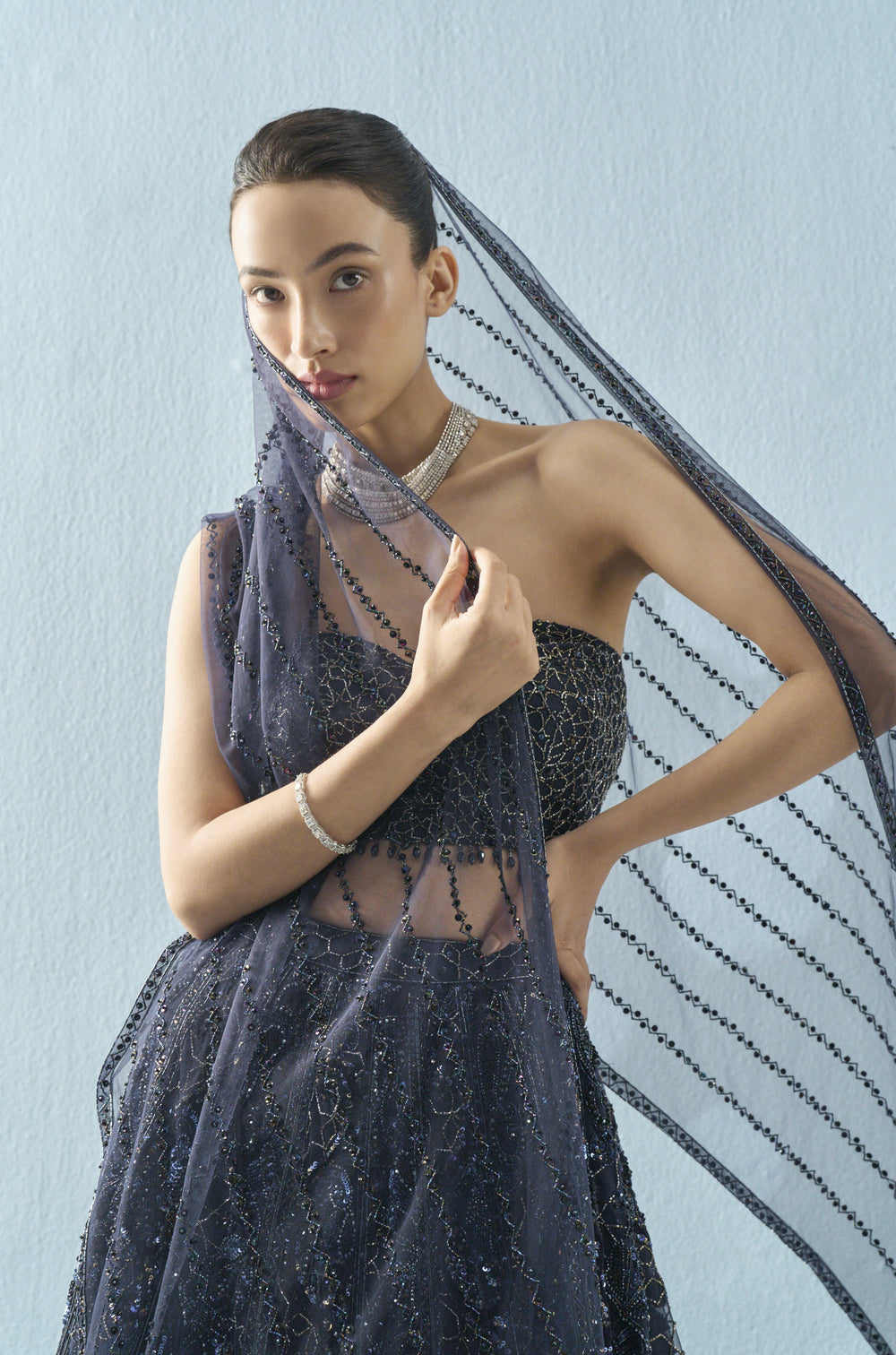 Step into the spotlight with this navy blue tulle lehenga set from Tamanna Punjabi Kapoor’s Noctelle collection a tribute to moonlit glamour and after-dark elegance. The strapless blouse and ethereal dupatta are adorned with a symphony of sequins, beads, cutdana, abla, and rich velvet appliqué, capturing the magic of midnight revelry. Sculpted to shimmer with every move, this ensemble evokes the allure of stardust and the spirit of celebration. Ideal for sangeets, cocktail soirées, or moonlit receptions, it’s bridalwear that dares to dazzle.