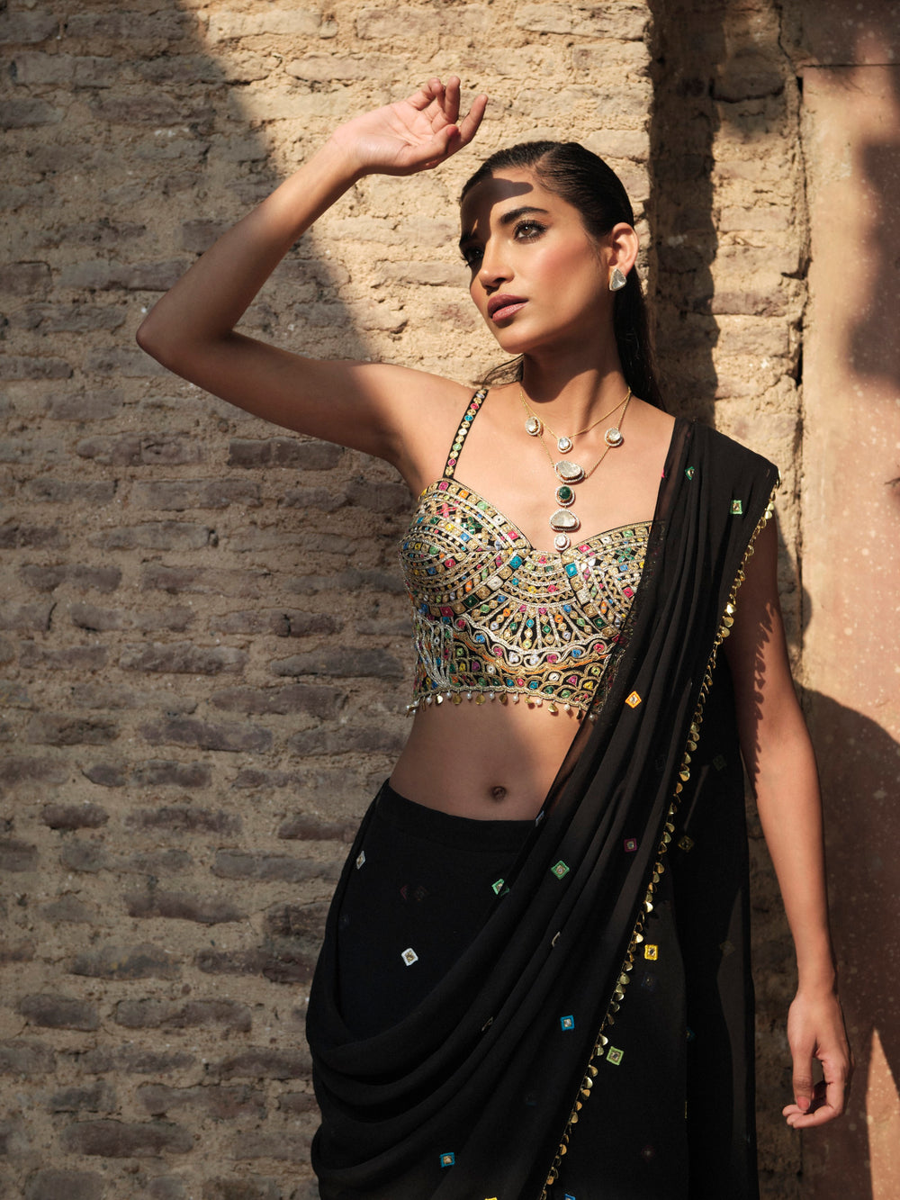 Elevate your wedding guest look with Tamanna Punjabi Kapoor’s Black Corset Pre-Draped Saree Set from the Sufiyaana collection. Crafted in flowing georgette, this pre-draped saree exudes effortless sophistication, while the corset-style blouse adorned with resham, gota, foil, and mirror embroidery adds a glamorous touch. Perfect for sangeet nights, receptions, or festive occasions, this modern silhouette blends tradition with contemporary charm—ideal for making a refined statement at any wedding celebration.