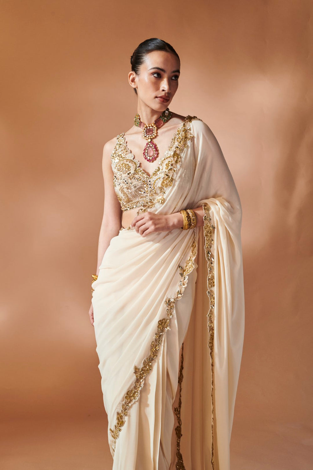Step into the spotlight at your wedding functions with this Ivory And Gold Saree Set from Tamanna Punjabi Kapoor’s Azra Collection. Crafted in soft georgette, this pre-stitched saree features exquisite gold cutwork embroidery along the border and a fully embellished blouse, perfect for brides or wedding guests. Ideal for mehendi, sangeet, haldi, or any festive bridal celebration, this saree exudes elegance and charm for every special occasion. Sequins, dori, resham, and mirror work add a luxurious touch, making it a must-have for your bridal wardrobe.