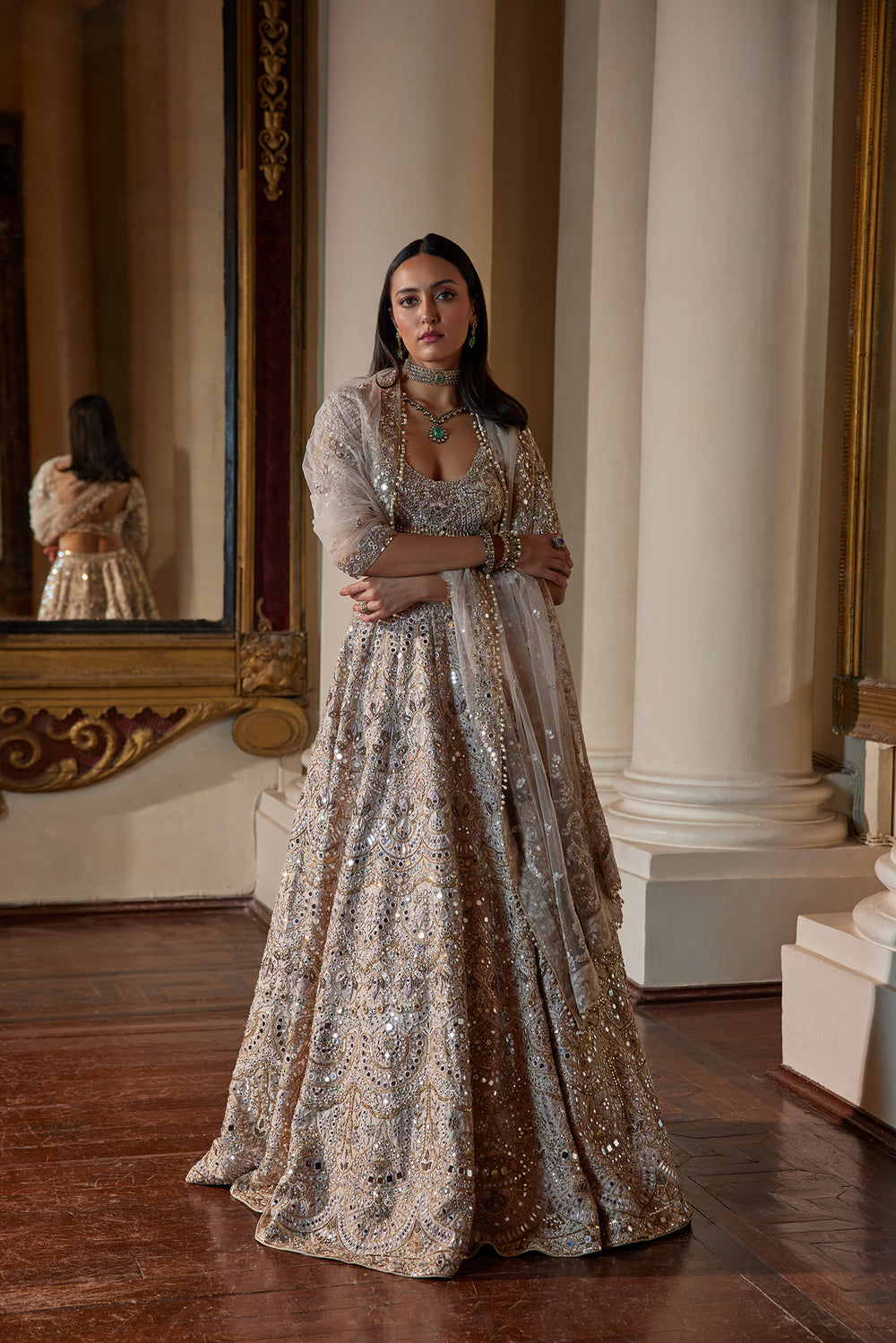 Dusky Rose Mirror Lehenga Set from the Serenade Bridal Collection. Crafted in luxurious raw silk and tulle, this enchanting bridal lehenga captures timeless elegance with intricate zardosi, sequin, resham, mirror, and bead embroidery. The soft dusky rose hue radiates romance and sophistication, perfect for a modern bride who loves classic charm. Designed to make every moment of your wedding celebrations unforgettable, this exquisite bridal lehenga is a true reflection of grace and grandeur.