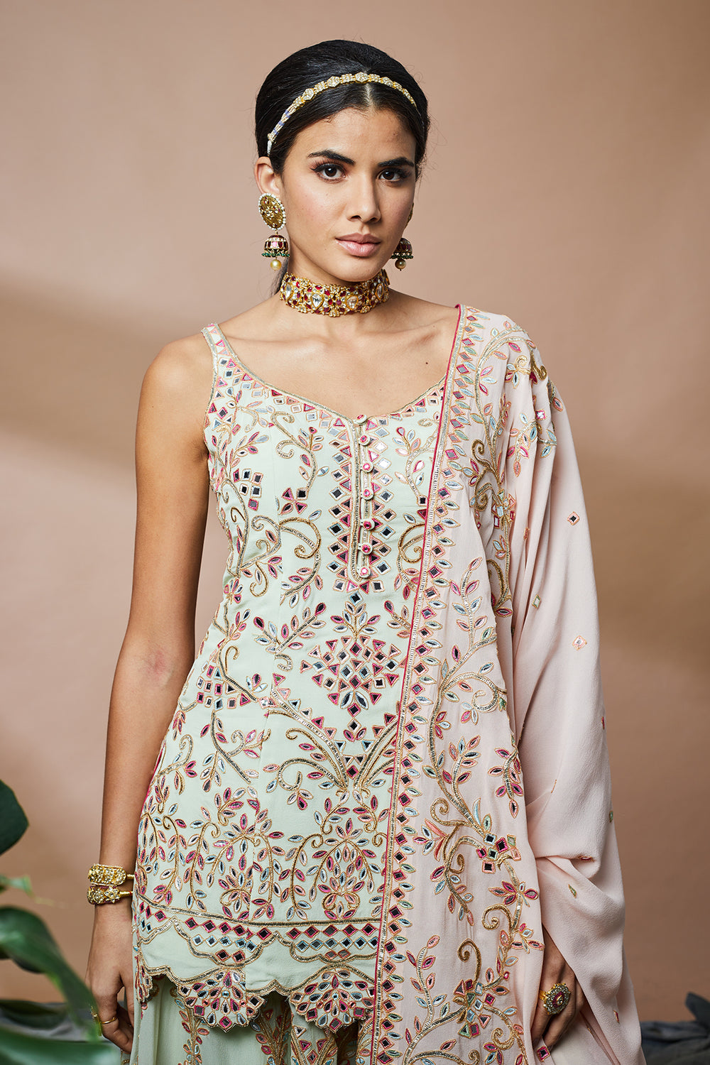 Green Georgette Sleeveless Kurta Paired With A Sharara With Gota, Foil, Mirror Embroidery. This Set Is Paired With A Pink Georgette Dupatta