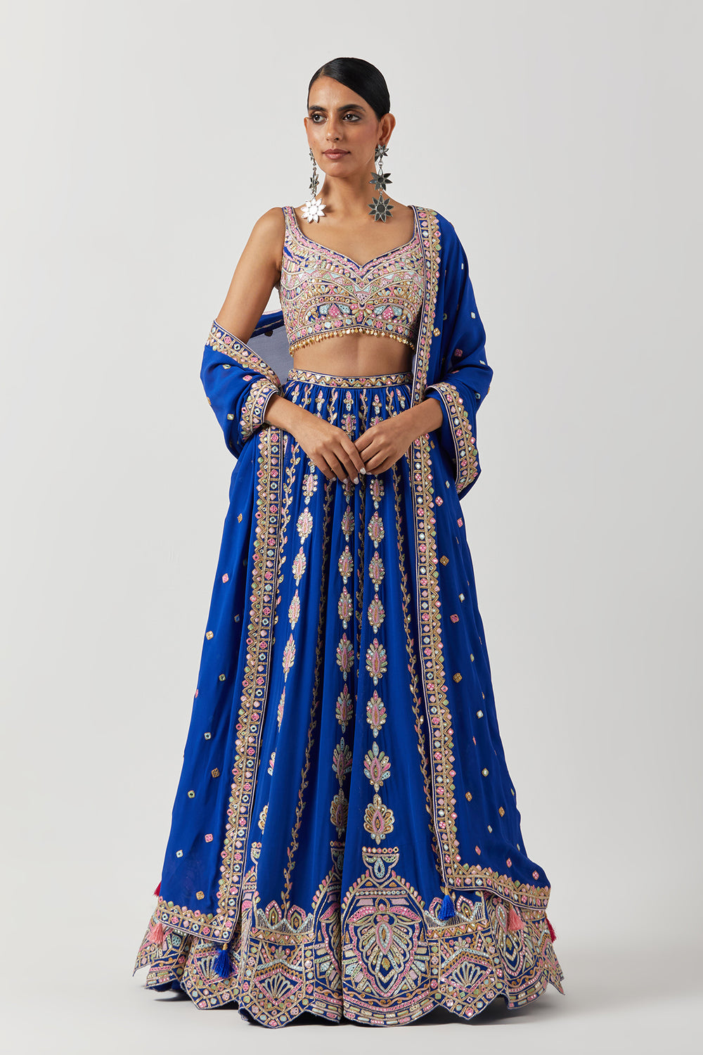 - Embroidery details: Resham,Gota,Foil,Mirror,Dori Embroidery, The Blouse Has Tassels With Stones, Metallic Coins On The Blouse Waist