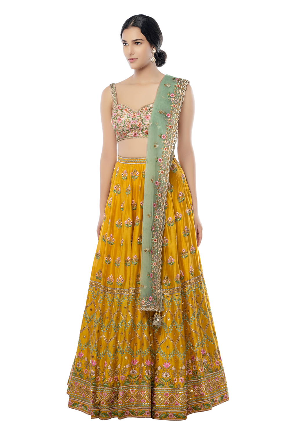 Mustard Chanderi Lehenga Set With Resham, Gota Embroidery Set With Pink Blouse And Sage Green Dupatta