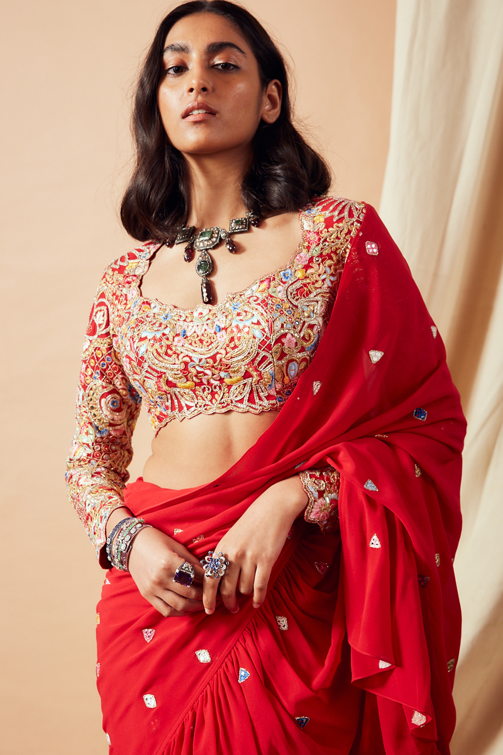 Red Georgette Ruffle Saree Paired With A Full Sleeve Blouse With Resham,Gota, Mirror Embroidery. The Saree Has Multi-Colored Resham And Mirror Motifs Allover
