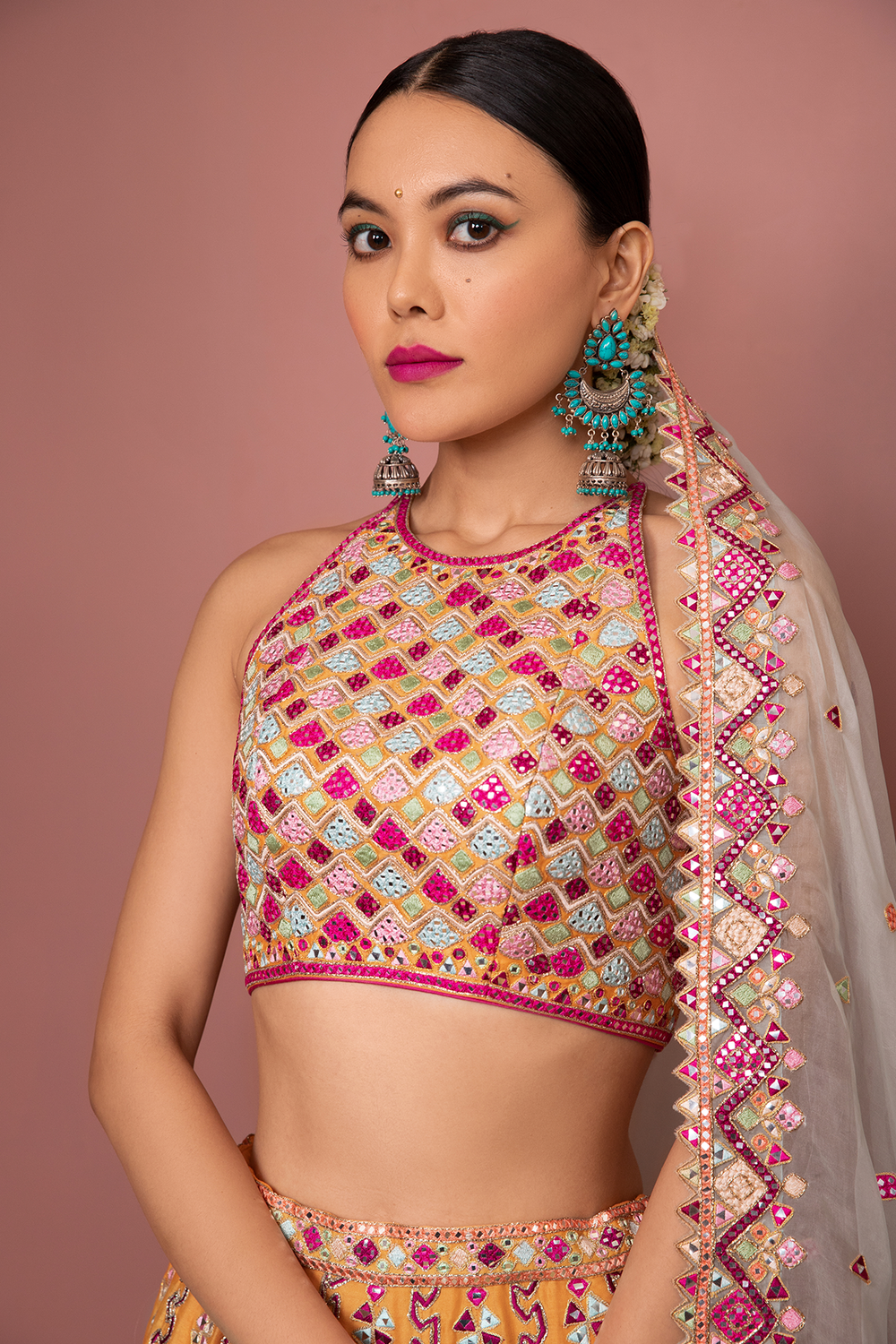 Tangerine Lehenga Set With Halter Blouse