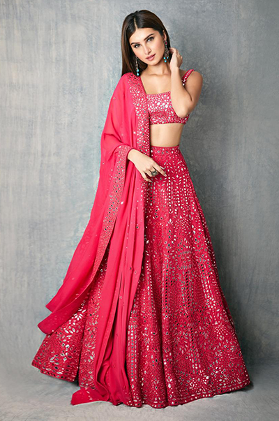 Red Georgette Heavy Geometry Lehenga With Foil Resham Embroidery