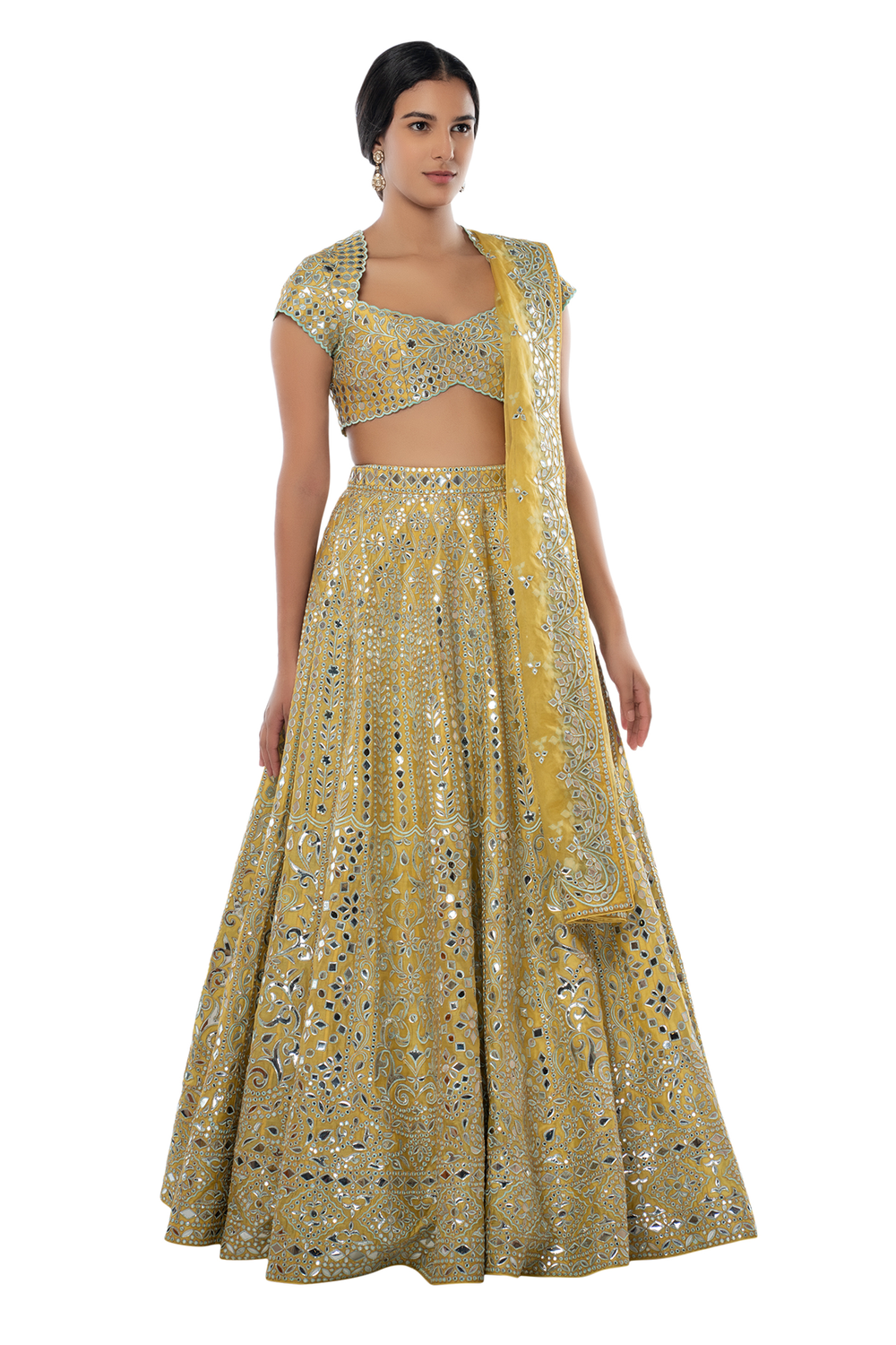 Yellow Chanderi Lehenga With Blue Resham And Foil