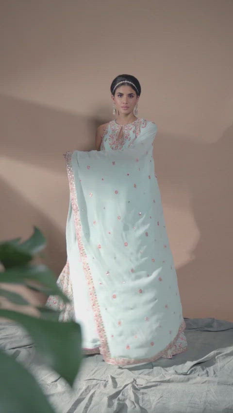 Blue Georgette Sleeveless Keyhole Kurta Paired With A Heavily Embroidered Sharara With Gota, Resham, Mirror And Foil
